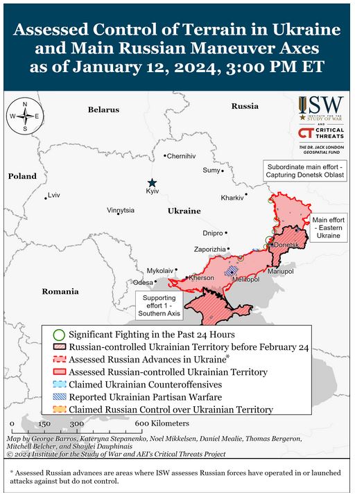 «Μεταξύ 6 Ιανουαρίου και 12 Ιανουαρίου 2024, οι ρωσικές ένοπλες δυνάμεις πραγματοποίησαν 23 επιδρομές με όπλα μεγάλης εμβέλειας από αέρος και θάλασσα, συμπεριλαμβανομένων συστημάτων υπερηχητικών πυραύλων Kinzhal, καθώς και μη επανδρωμένων εναέριων οχημάτων, σε εγκαταστάσεις του στρατιωτικού-βιομηχανικού συγκροτήματος της Ουκρανίας.